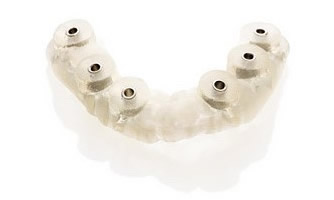 CTとシミュレーションソフトを用いて得たデータをもとに、患者さんそれぞれのお口の状態に合わせて製作した「マウスピース型の補助器具」です。実際にインプラントを埋め込む位置や角度、深さを示すもので、オペ時間を短縮し、正確性が格段に向上します。