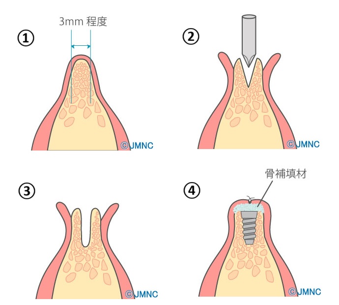 インプラントを埋める歯茎の中の骨が、深さに問題はないものの前後の厚みが足りない場合に有用です。該当箇所の骨にあえて割れ目を入れて、ゆっくり押し広げながら幅を作り、その割れ目にインプラントを埋め込みます。できた隙間には骨補填材を詰め、最終的に骨と置き換わることでインプラントを固定する仕組みです。
