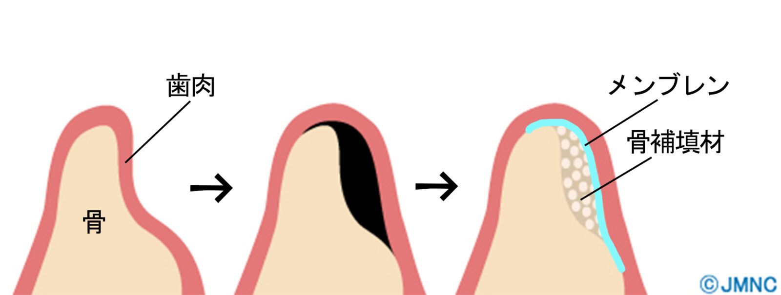 最も一般的な方法で、人工的な骨補填材を骨の足りていない隙間に詰め、メンブレンと呼ばれる特殊な人工膜で覆って保護します。これらが骨の再生を促しつつ、やがて体内に吸収されながら骨と置き換わる仕組みです。