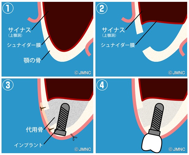 上あごの奥歯部分にインプラントを埋める際に用います。頭蓋骨の目の下、鼻の横辺りには「上顎洞(サイナス)」という空洞があり、その底部分の粘膜(シュナイダー膜)の下に隙間を作って骨補填材を詰めることで、地盤となる骨に厚みを出す方法です。